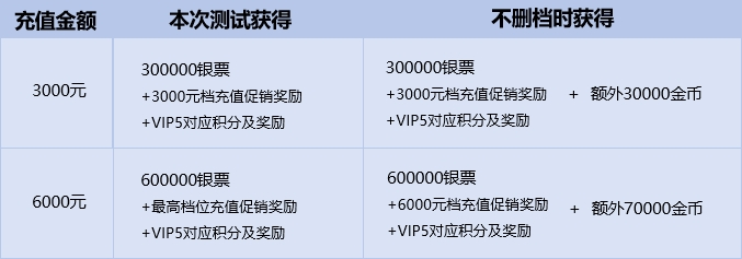 1)封测期间累充金额 ≤5000元,在不删档首服开启后,返还为100%银票+10%金币